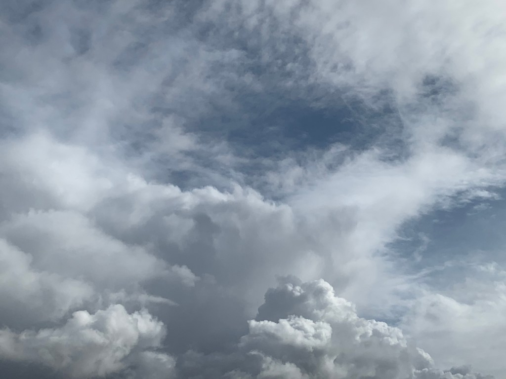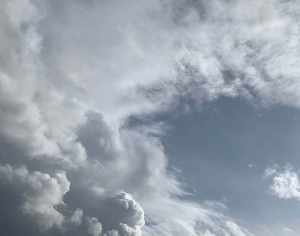 Photographed just yesterday, these cloud images appear to be the same, yet they are at different locations in the sky. I was walking to a different location on campus and was in awe at the incredible view above me. I felt as if I could fly.